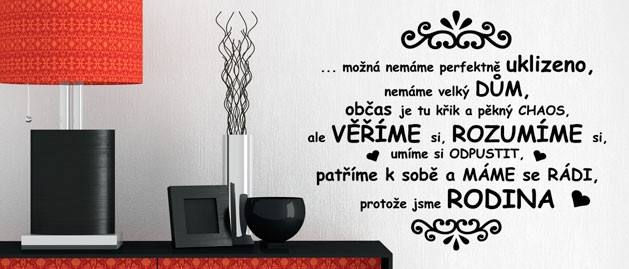 Chcete doručit zboží do Čech? Prohlédněte si motiv Nálepka na zeď s citátem - Jsme rodina Ďalšie obľúbené nálepky na stenu:Posledné navštívené nálepky na stenu:Buďte kreatívni a vytvorte si čarovný domovMožností, ako skrášliť interiér, dnes existuje veľmi veľa. Jedným z najdôležitejších aspektov interiérového dizajnu je povrch stien, ktorý dáva nálepkám skvelou príležitosťou ako zničiť ich fádnosť a oživiť interiér niečím zaujímavým a osobitým. Či už plánujete nalepiť nálepky na stenu do detskej izby či obývačky, buďte kreatívni, zapojte svoju fantáziu a snažte sa rozvinúť dizajn stien do nejakého téme. Medzi veľmi obľúbené motívy patrí napr. nálepky na stenu strom, kvety alebo motýle. Nový trend nastavujú nálepky na stenu citáty alebo drobný doplnok v podobe nálepky na stenu okolo vypínačov. Kombinujte barvy a volte správné velikosti. Kombinujte farby a voľte správnej veľkosti. Vyberajte tradičné i nevšedné motívy, je rozhodne z čoho. Mnoho ďalších motívov nájdete tu: